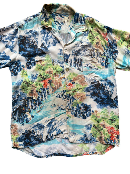 Vintage Made in Japan Penney's Navy/Blue/Green Landscape Aloha Shirt SZ M | Seattle Vintage Rayon Hawaiian Shirt | Barn Owl Vintage Clothing Seattle