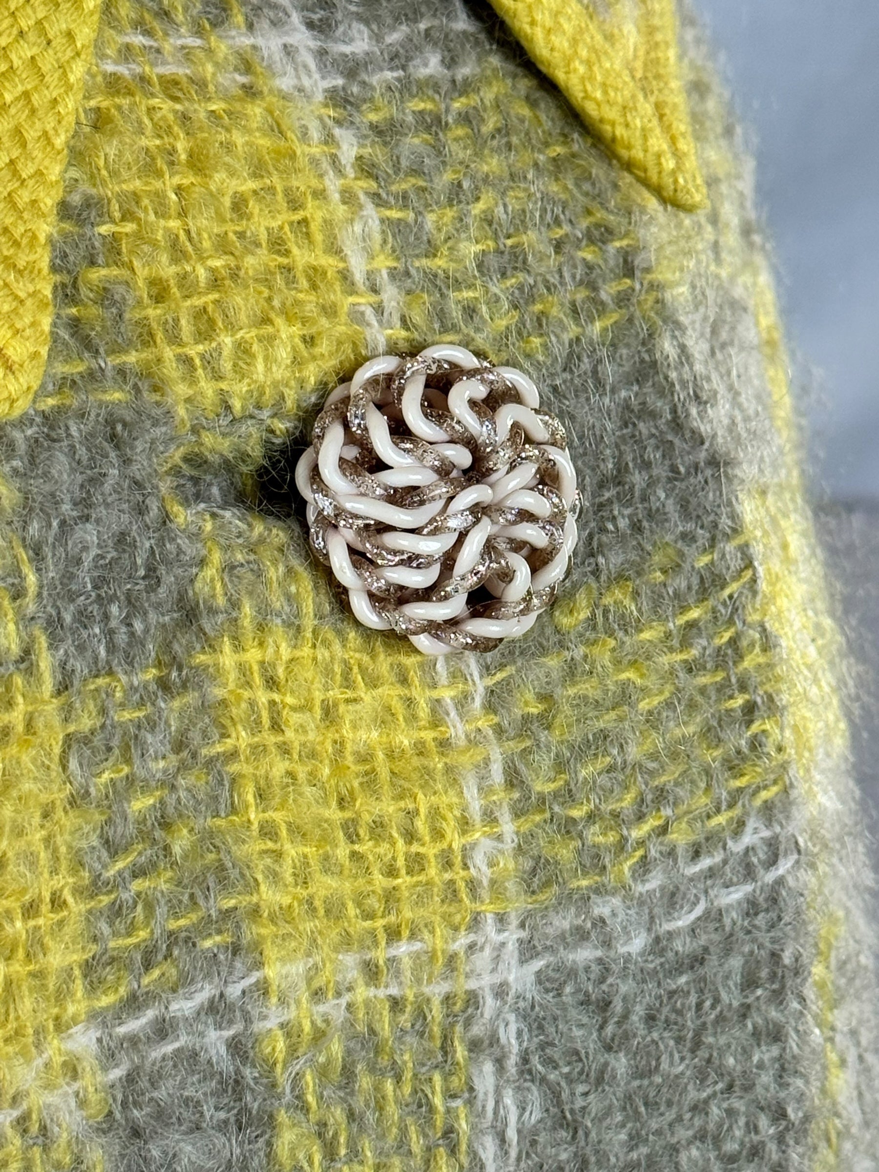 This yellow and gray mohair blend capelet coat is in good vintage condition with no flaws to note. No maker or material tag. Cool big buttons. Nylon/acetate lining.