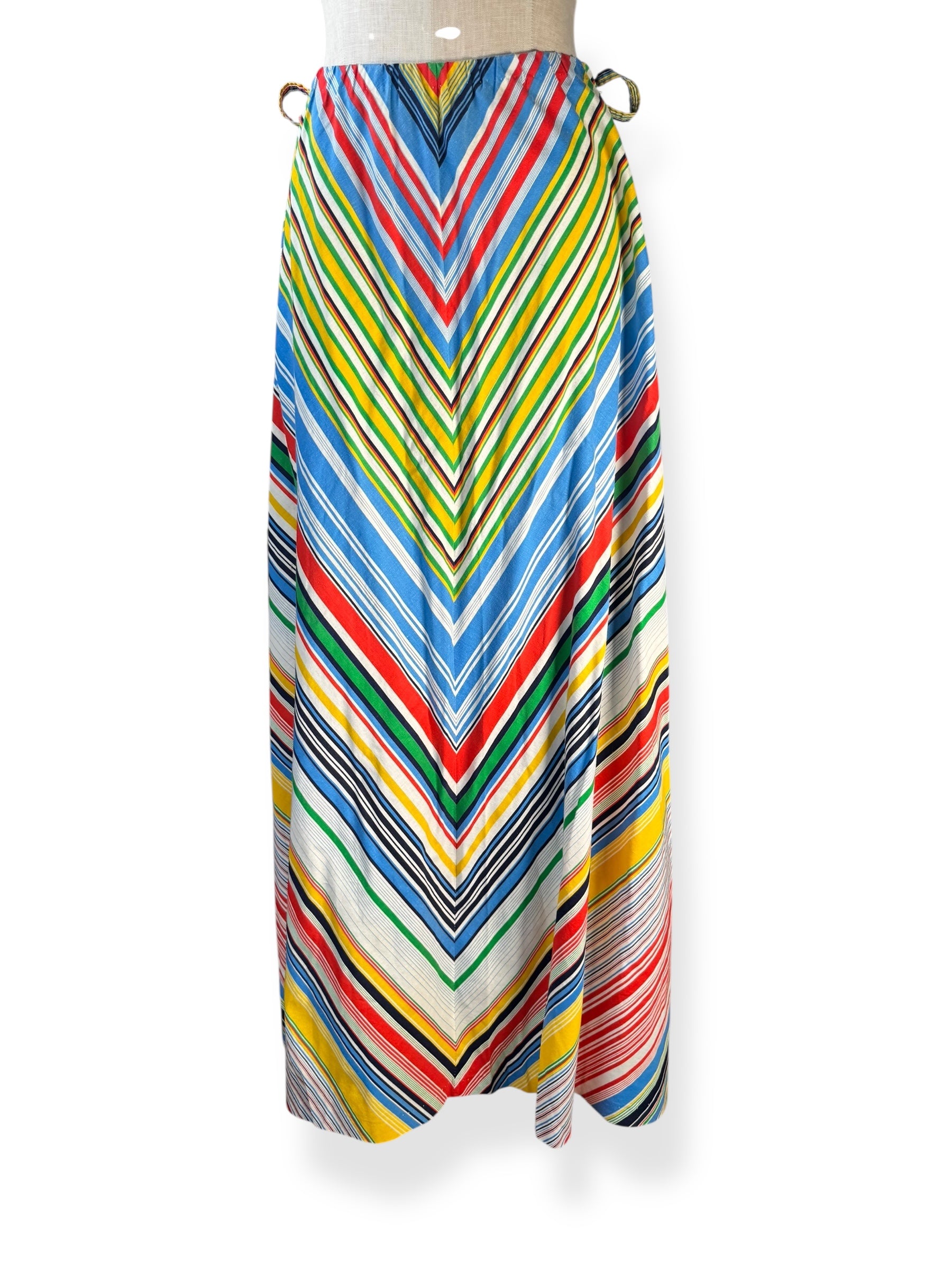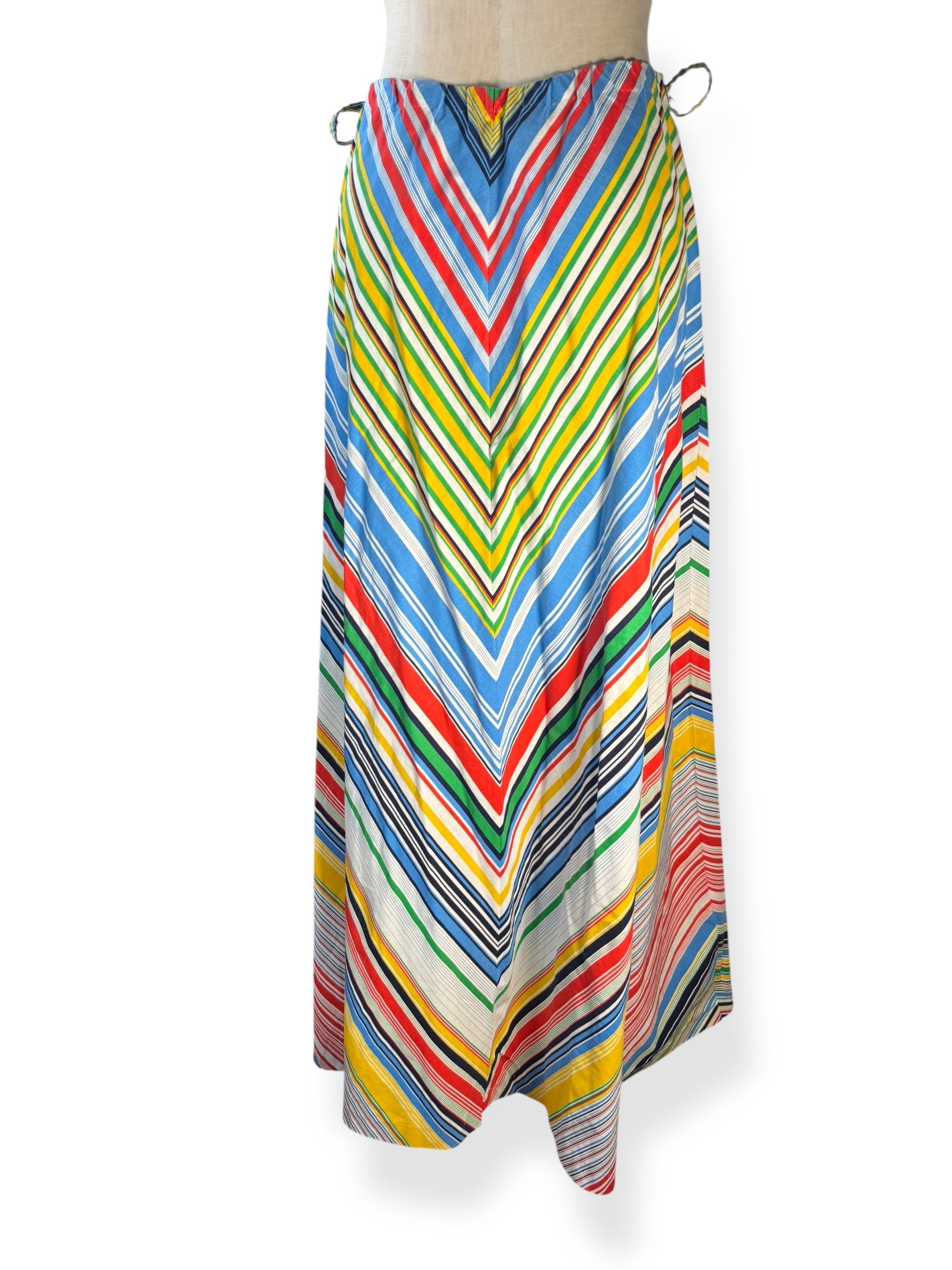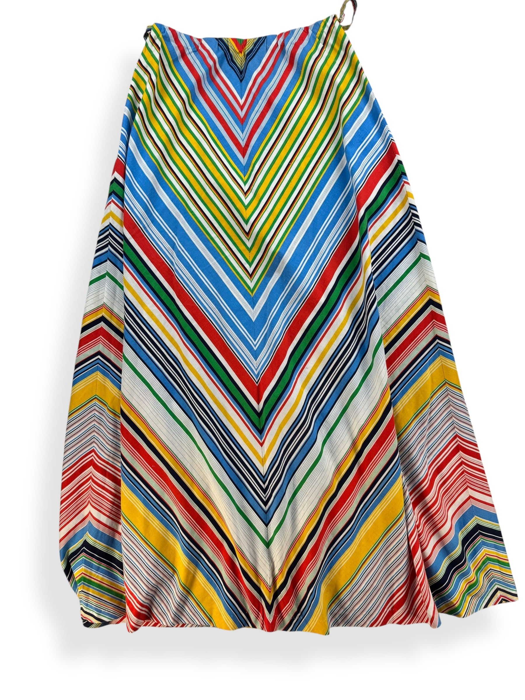 This simple A-line maxi-skirt is in great condition with no flaws. Primary colors in a chevron pattern with an elastic waist and two loops for a belt. 100% cotton.