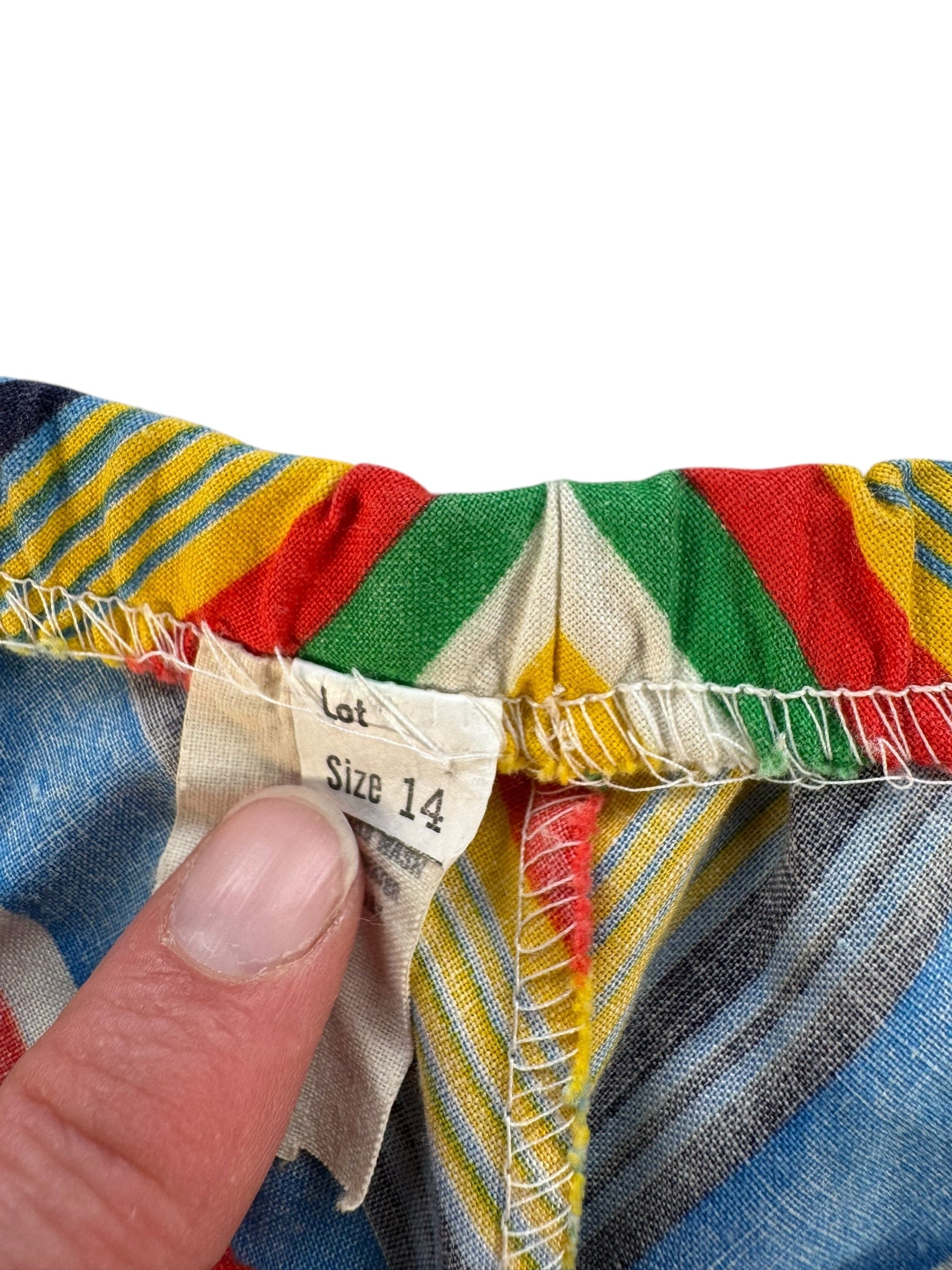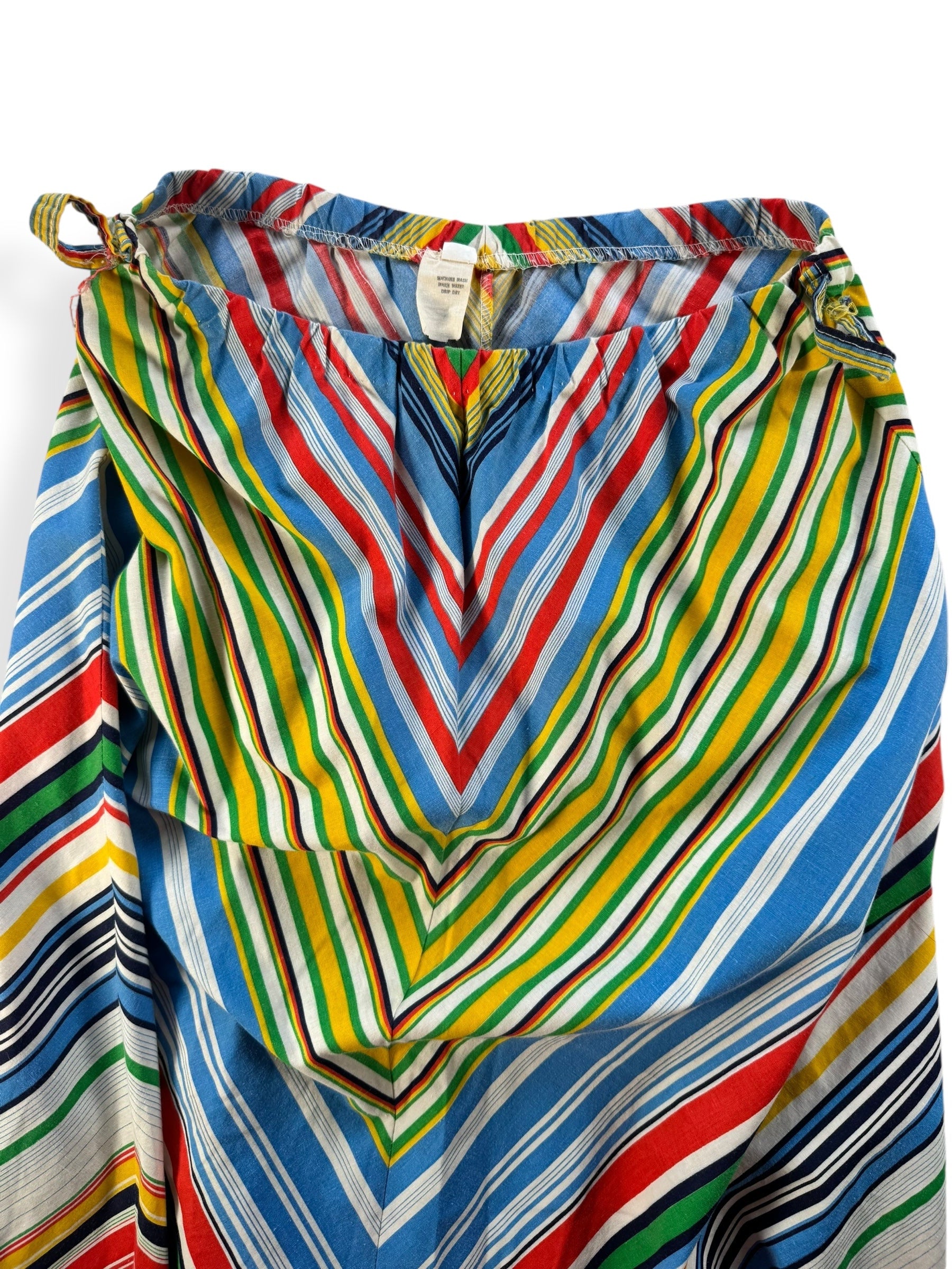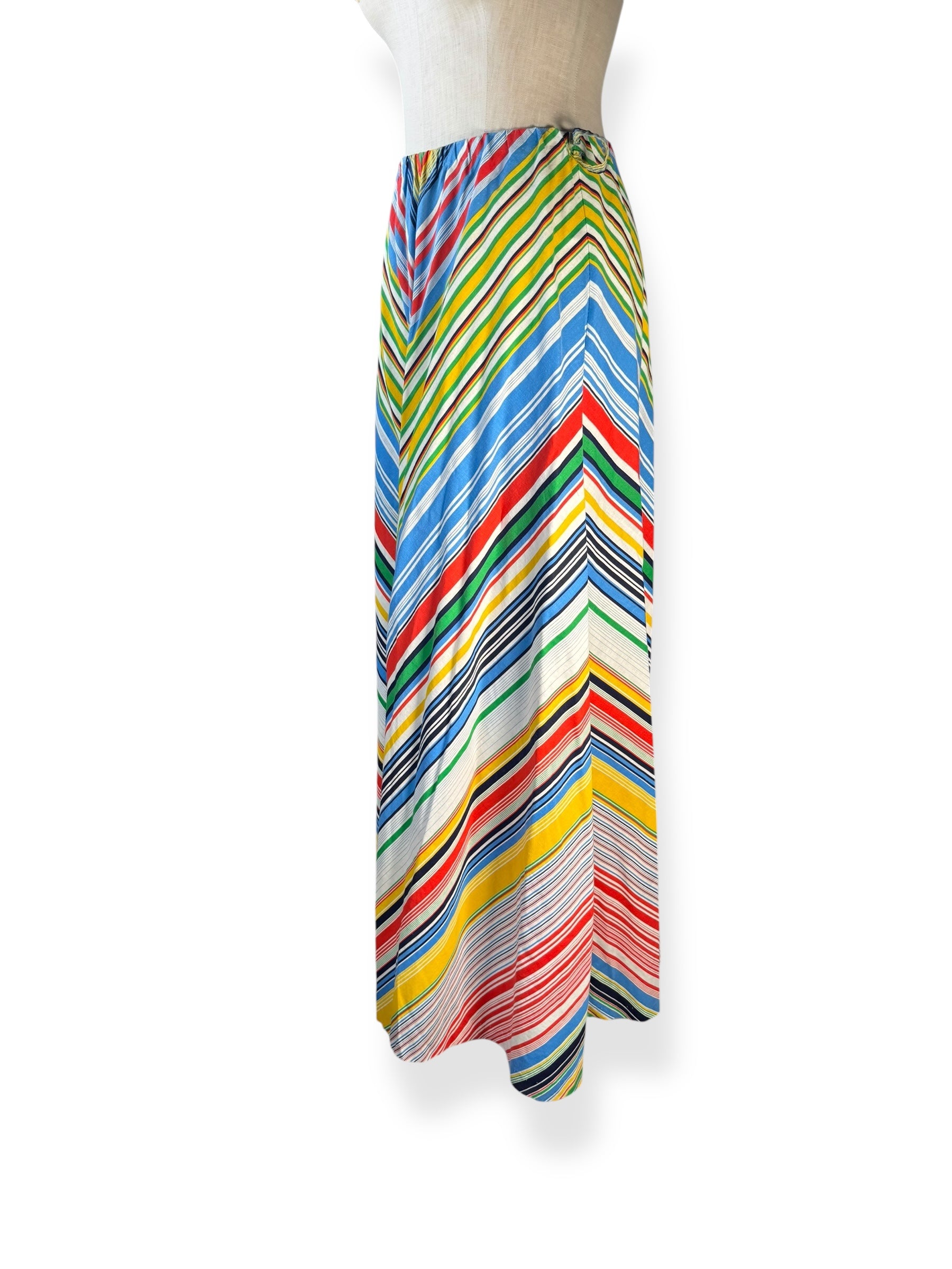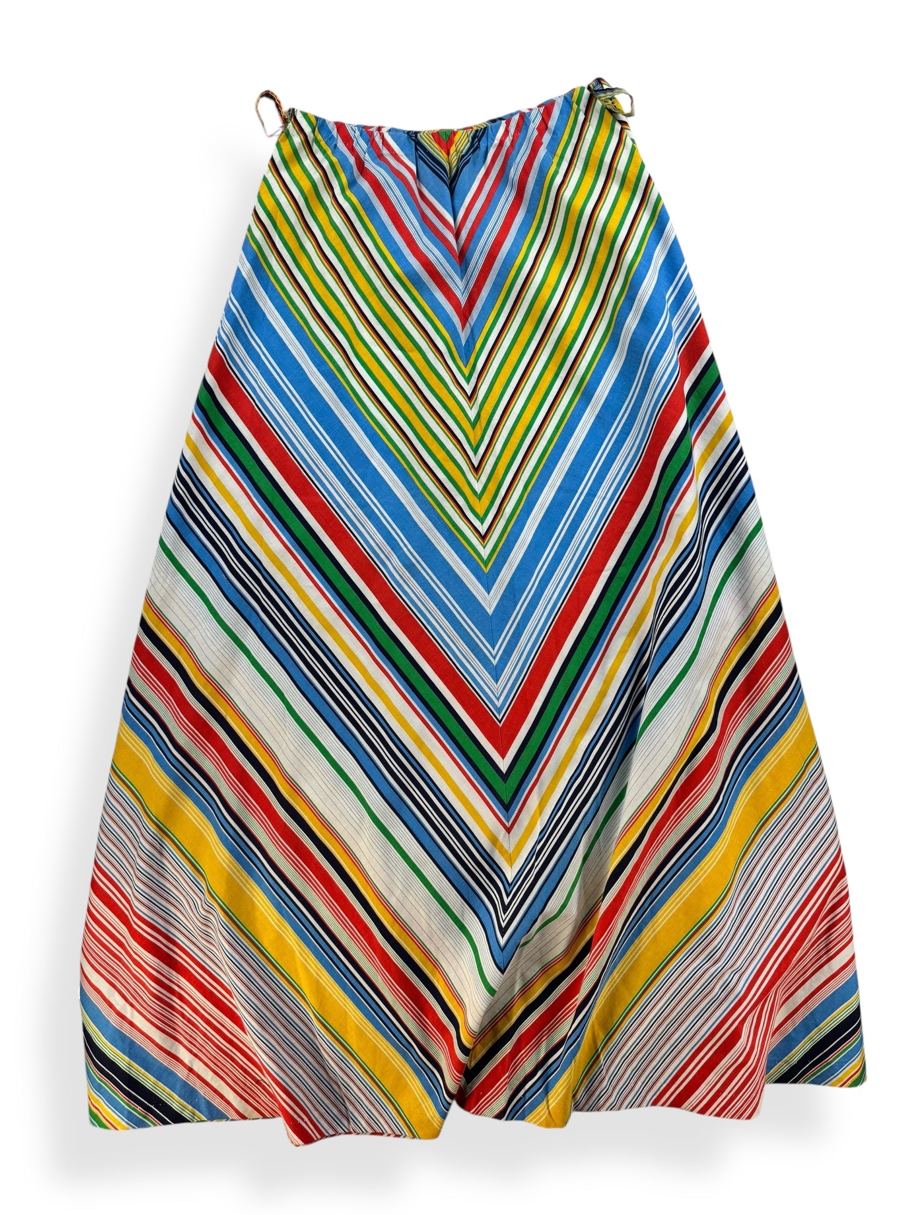 This simple A-line maxi-skirt is in great condition with no flaws. Primary colors in a chevron pattern with an elastic waist and two loops for a belt. 100% cotton.