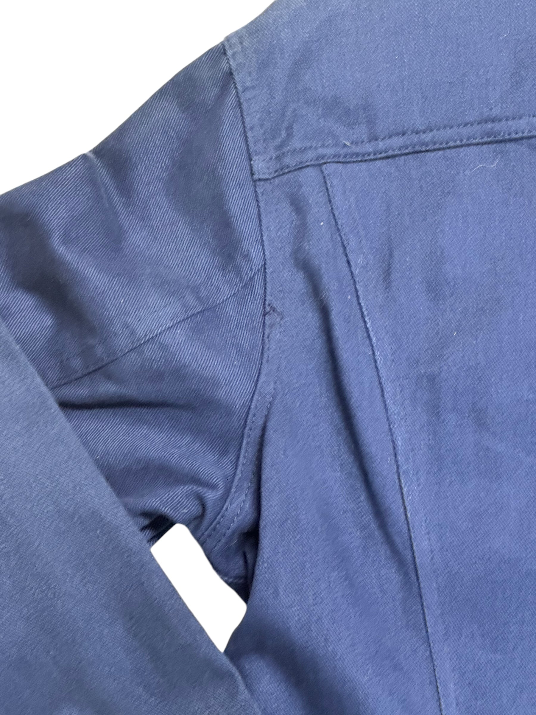 This jacket is in deadstock condition with very minor storage fades on the shoulders. So minor that it was hard to photograph. This is a classic Big E trucker with navy blue moleskin material.