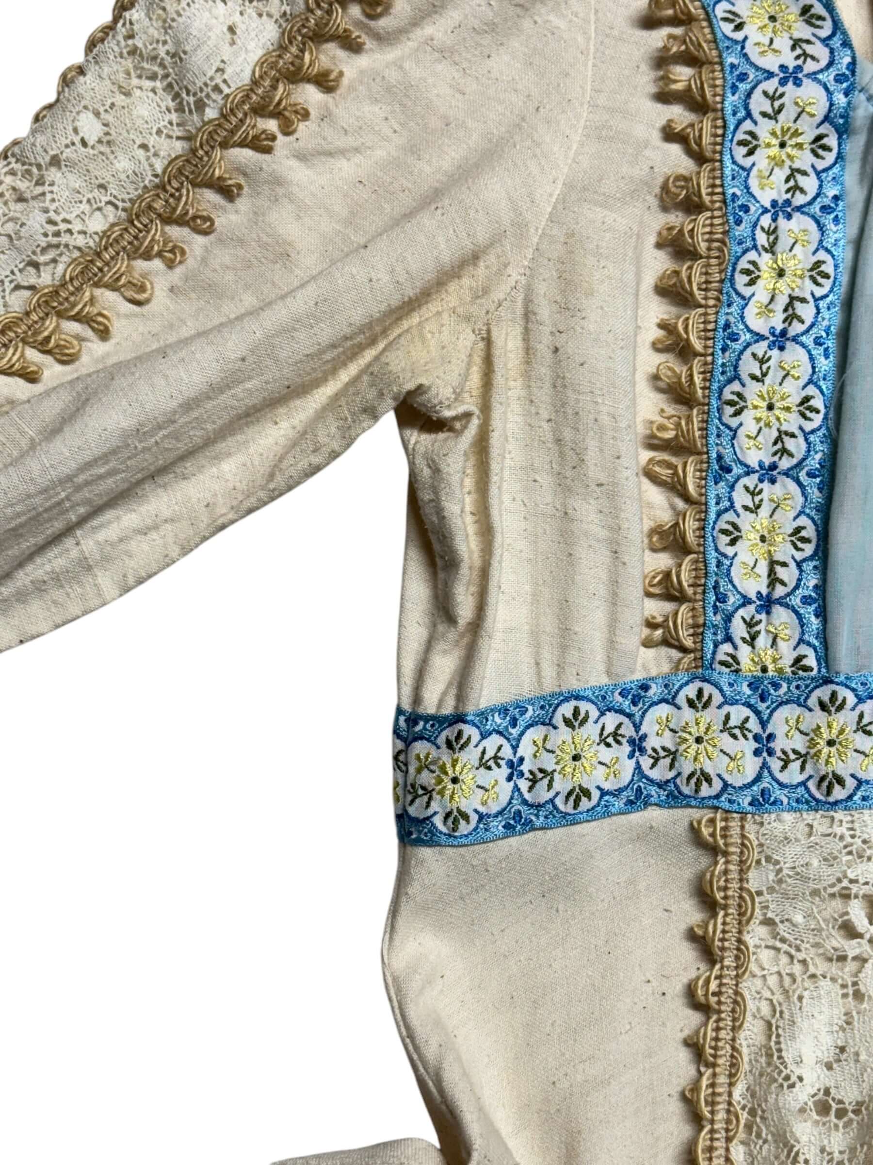 This dress is in decent condition with some visible flaws. There is yellow/tan staining along the bottom of the skirt on the dress and the blue layer. The underarms show some wear like minor staining and pilling. Please refer to pictures and zoom in if possible. It is still wearable and has a lot of life left and has great details!