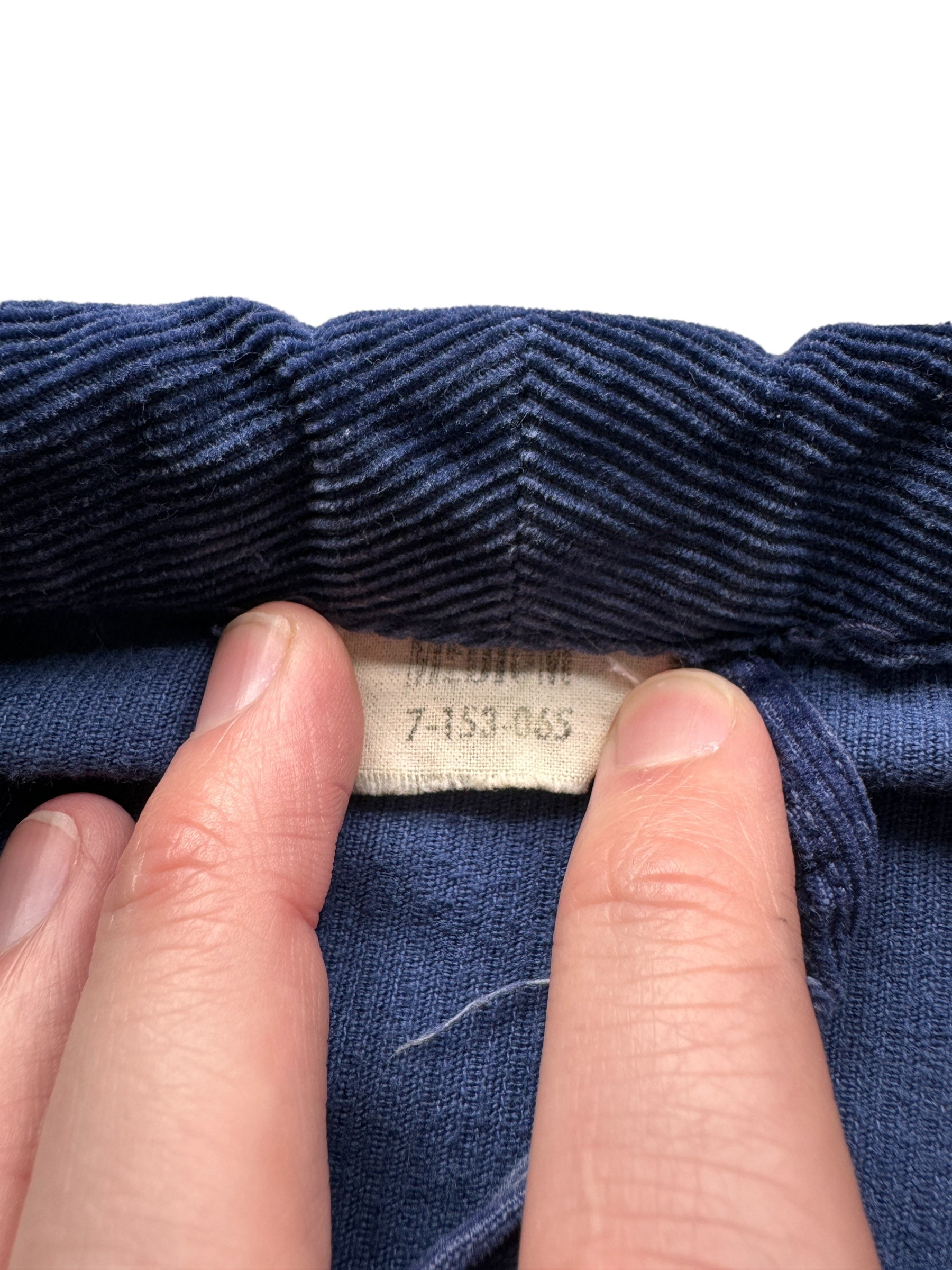 50s era US military corduroy convalescent bathrobe. Coat hanger loop not sewn on one side. Some loose threads here and there. Overall in good vintage condition.