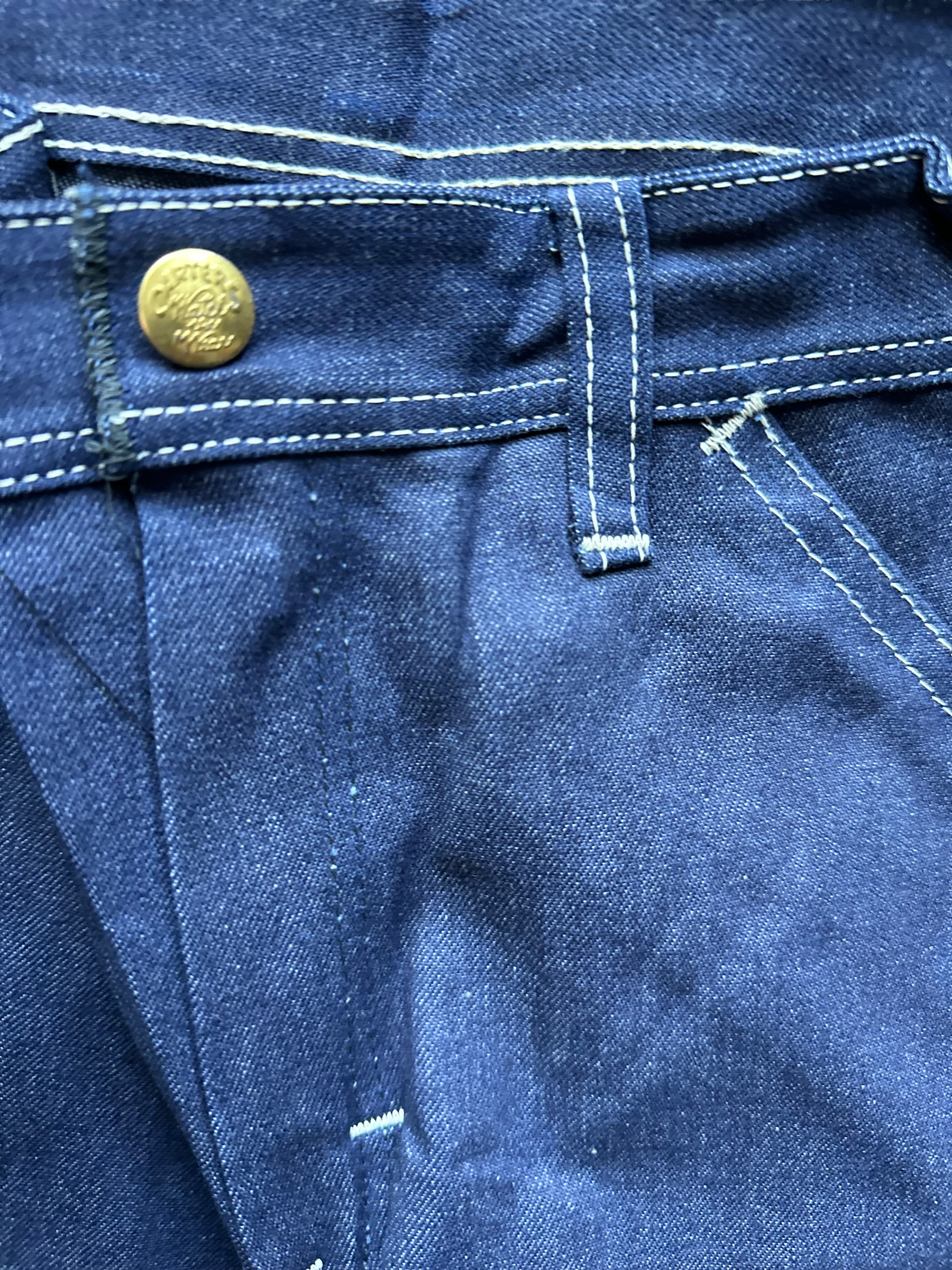 The pride of Lebanon, N.H., Carters Jeans and Overalls motto was Watch the Wear which you'll be able to do with this deadstock pair of Carters Carpenter Jeans. The raw denim has been sanfordized to prevent shrinkage. The waist snaps close and the zipper is a Talon 42 zipper. These products have not been used, though may have some storage wear which we have attempted to document in the photos.