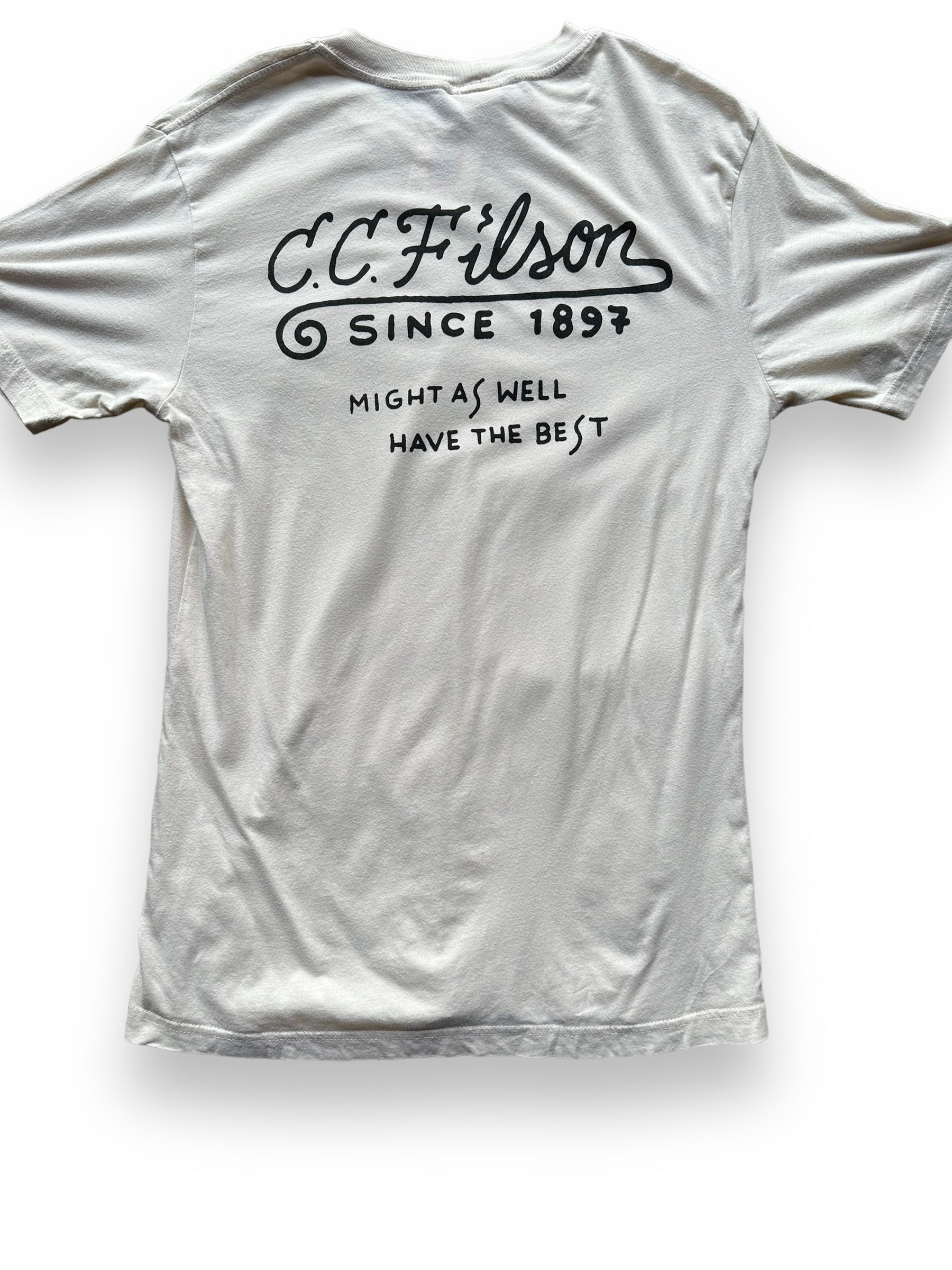 Two-Sided Filson Tee with Fish Graphic on Front and Filson Might As Well Have the Best on back. Size is XS. Made in Bangladesh. 100% Cotton. Good condition.