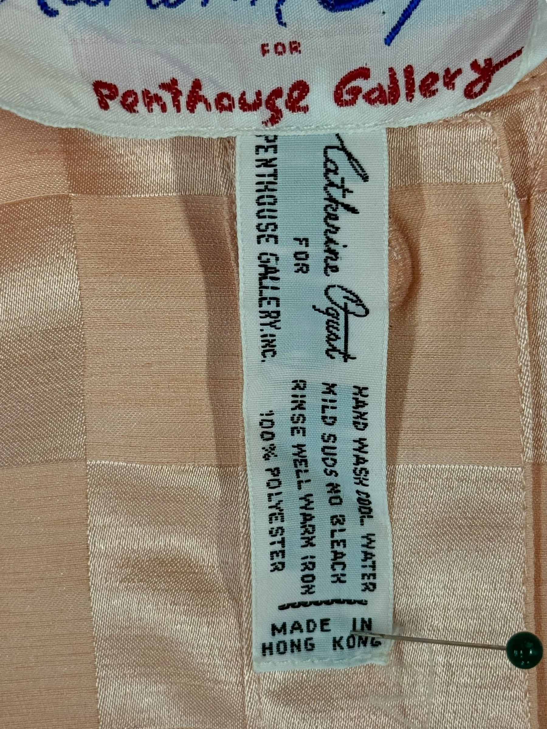 This Katherine Ogust dress is in fantasic condition with no flaws. A peach colored check pattern on polyester fabric features wide sleeves, knotted buttons, a Mandarin collar and a wide belt to tie at the waist.