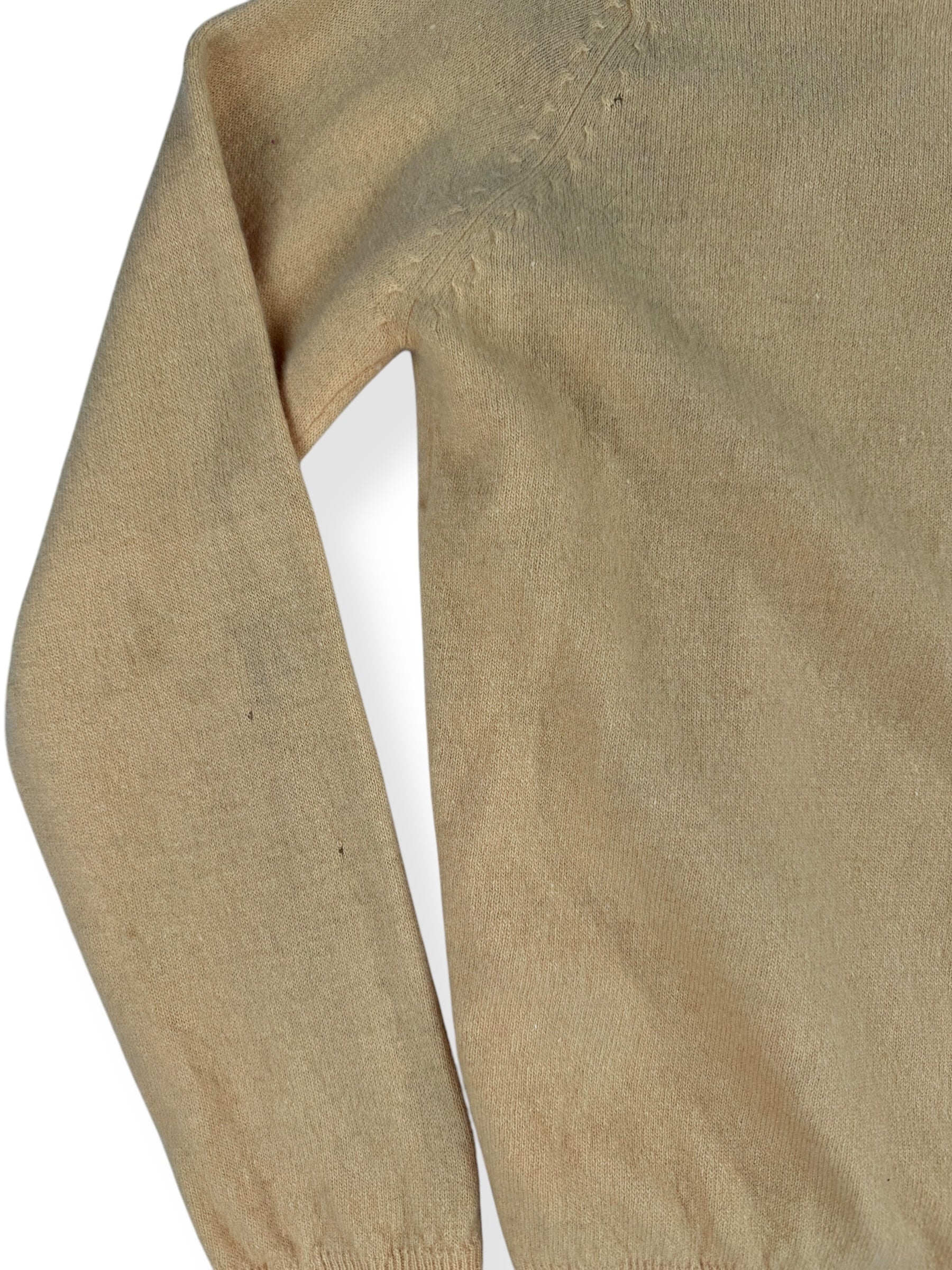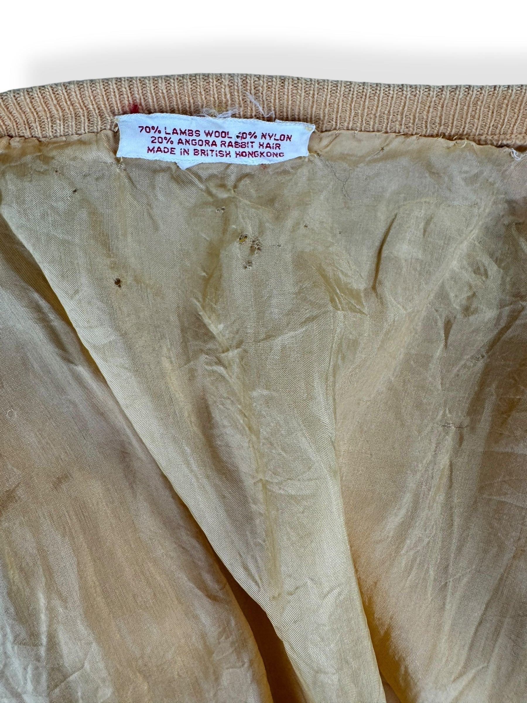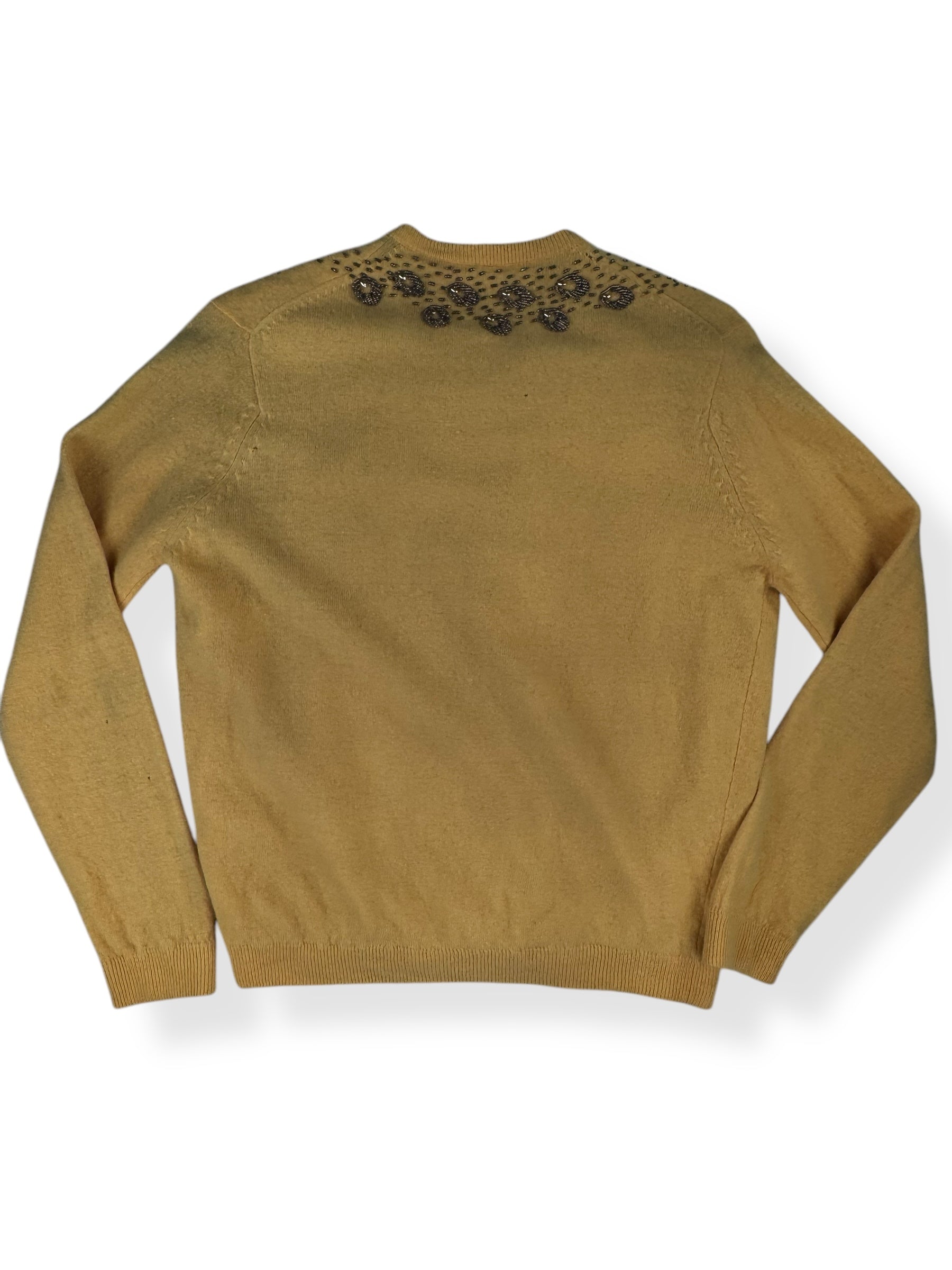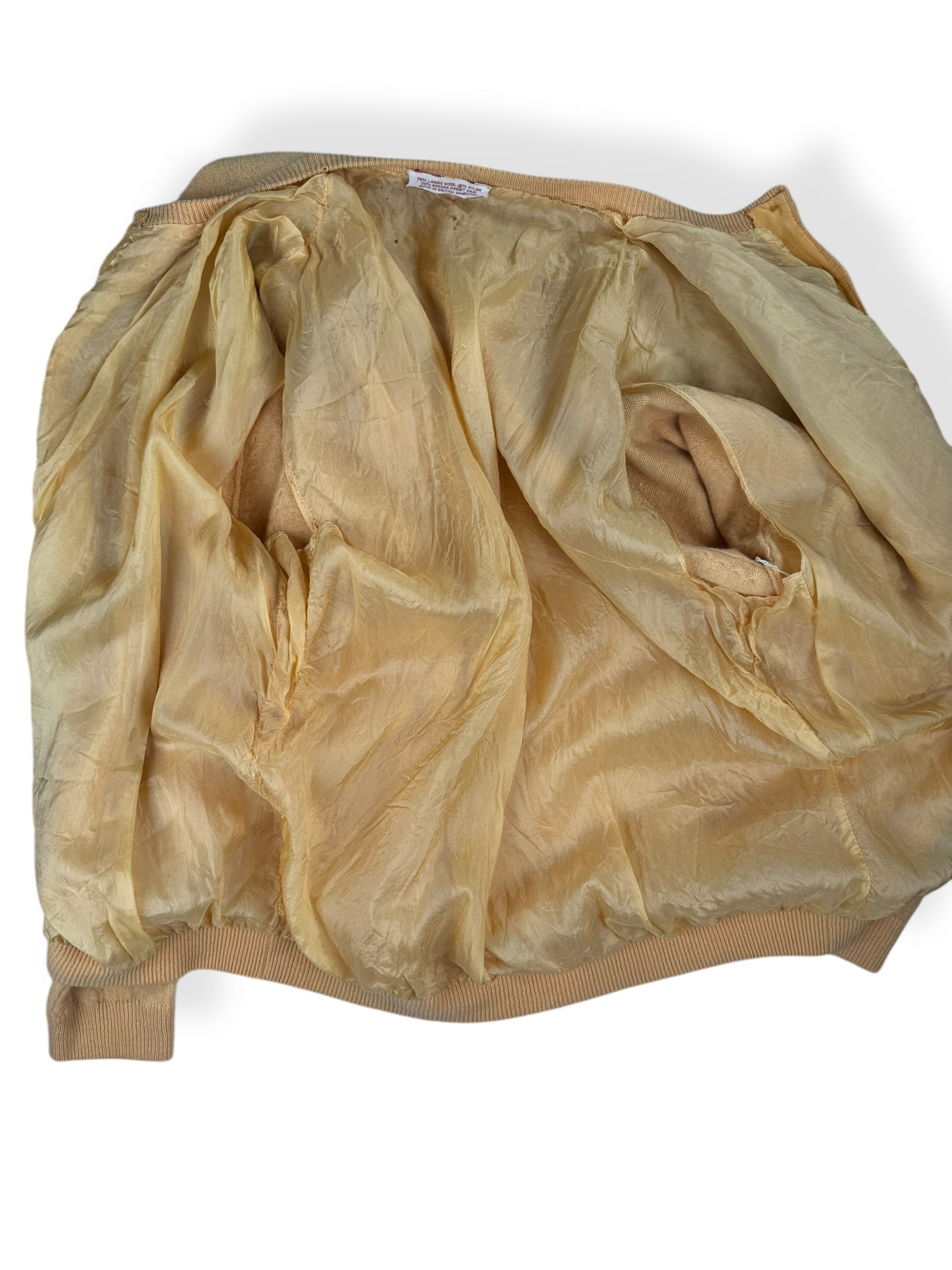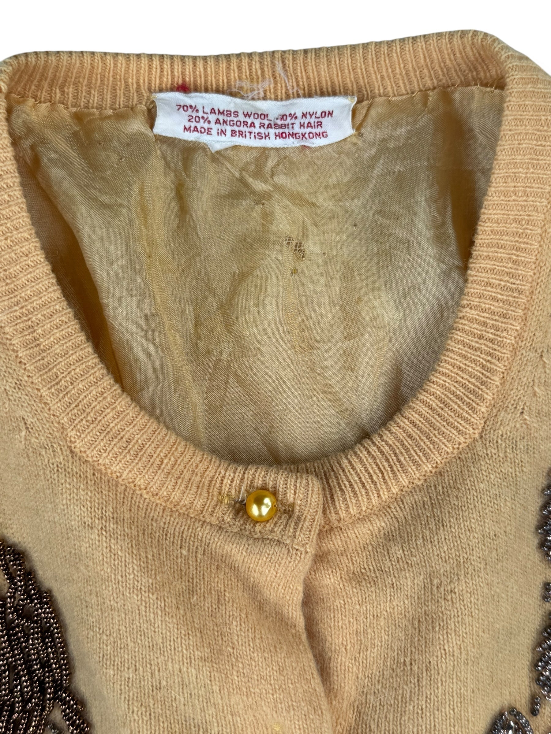 This yellow cardigan is in decent condition for it's age. Some signs of wear including small moth holes, holes in the lining and missing the sleeve lining. Please refer to pictures for details. Gorgeous and intact beading of a peacock and feathers. Still wearable and quite stunning!