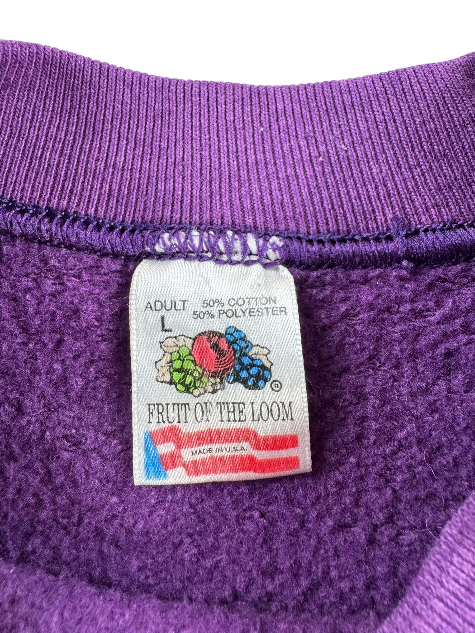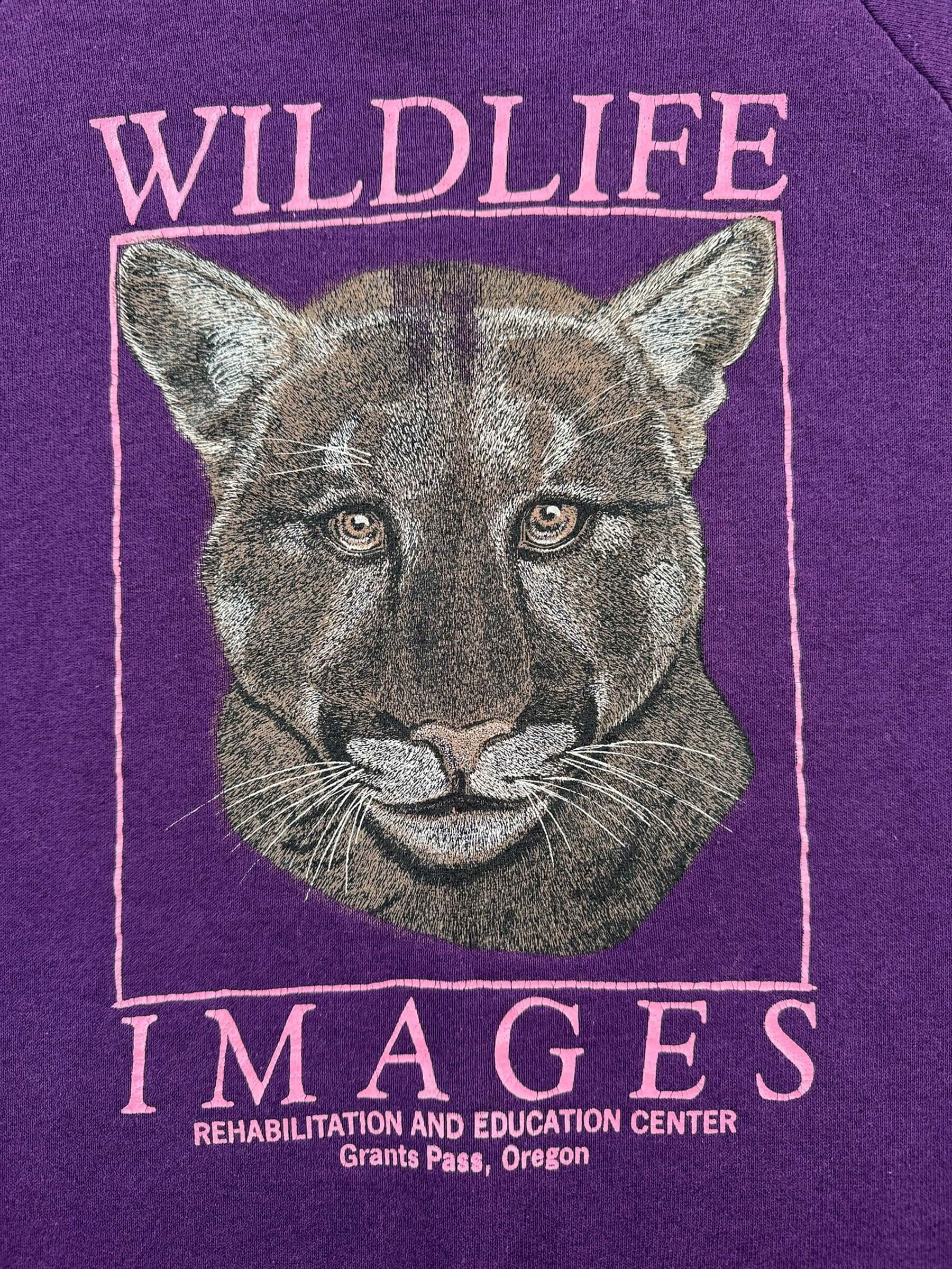 Vintage purple mountain lion crewneck. Printed on a Fruit of the Loom sweatshirt. Made in USA. 50% cotton, 50% polyester blend. Tagged large but measures out to a medium. Faded purple in some areas, graphic is cracking, and a minor stain near hem, but overall in good vintage condition.