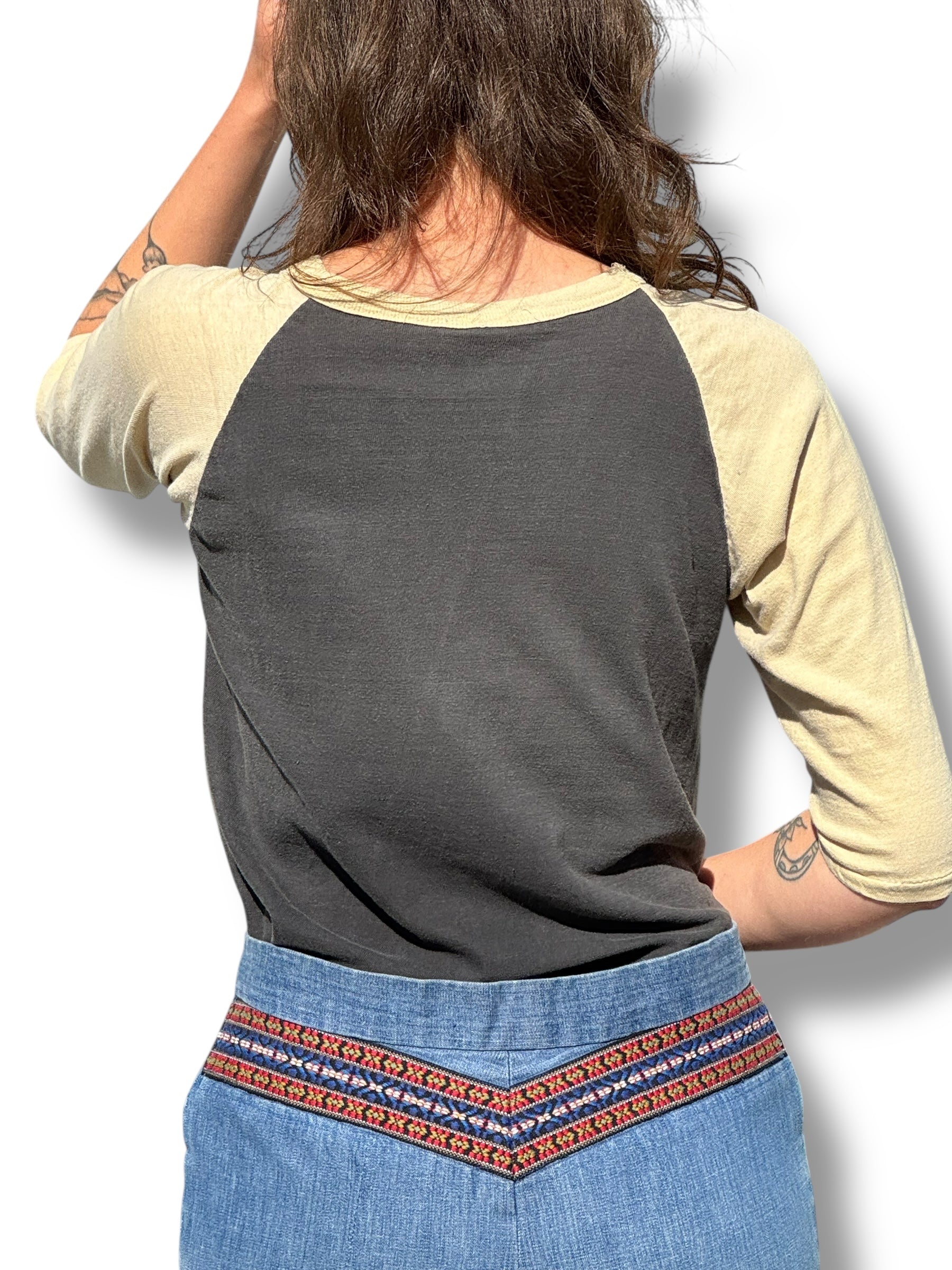Vintage Seaside Heights NJ baseball tee. Tag faded. Printed on a single stitch shirt. Feels like 100% cotton. Faded black. some loose threads on the hem. Minor discoloration under arms. Overall in good vintage condition.